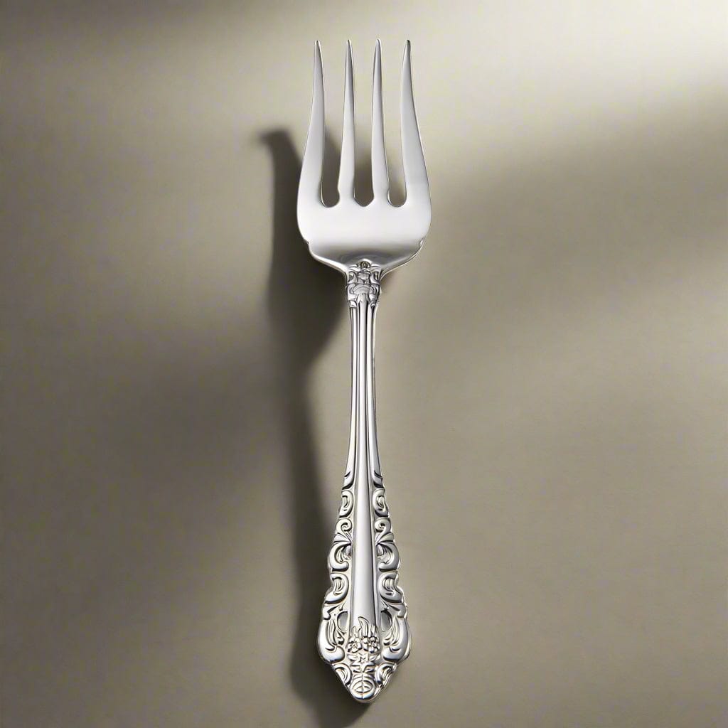 This Wallace Antique Baroque Serving Fork is styled with a historical sensibility. each piece is elaborately sculpted with curling tendrils along pierced edges. culminating in a gently pointed end.