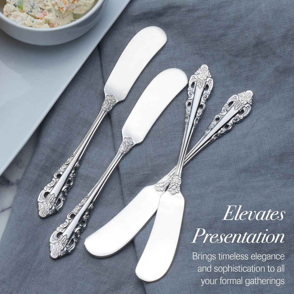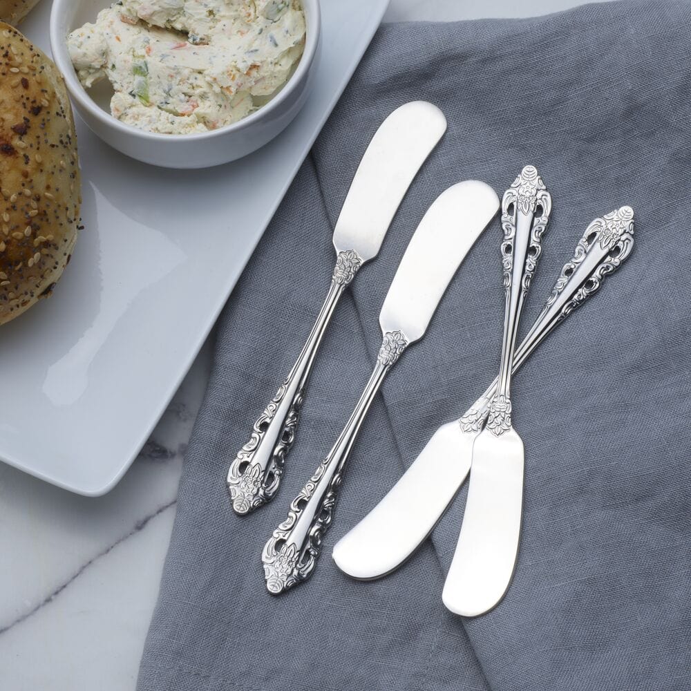 These Wallace Antique Baroque spreaders are styled with a historical sensibility. each piece is elaborately sculpted with curling tendrils along pierced edges. culminating in a gently pointed end.
