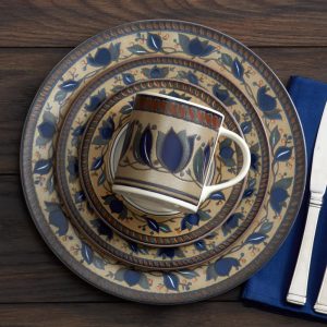 This elegant casual stoneware dinnerware has been a favorite since its introduction in 1986. The bold stylized navy blue tulips and vines on a rustic background flow around each of the pieces. Add the creamer and sugar. oval covered casserole. or any of the accessory pieces to expand your elegantly casual table. And once the dinner is over. all the pieces can go in the dishwasher for easy clean up. The pattern is also oven safe. microwave save and freezer safe. Set of 4 salad plates. each measures 8-1/2 inch diameter.