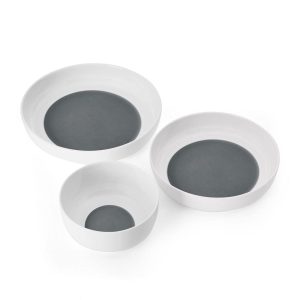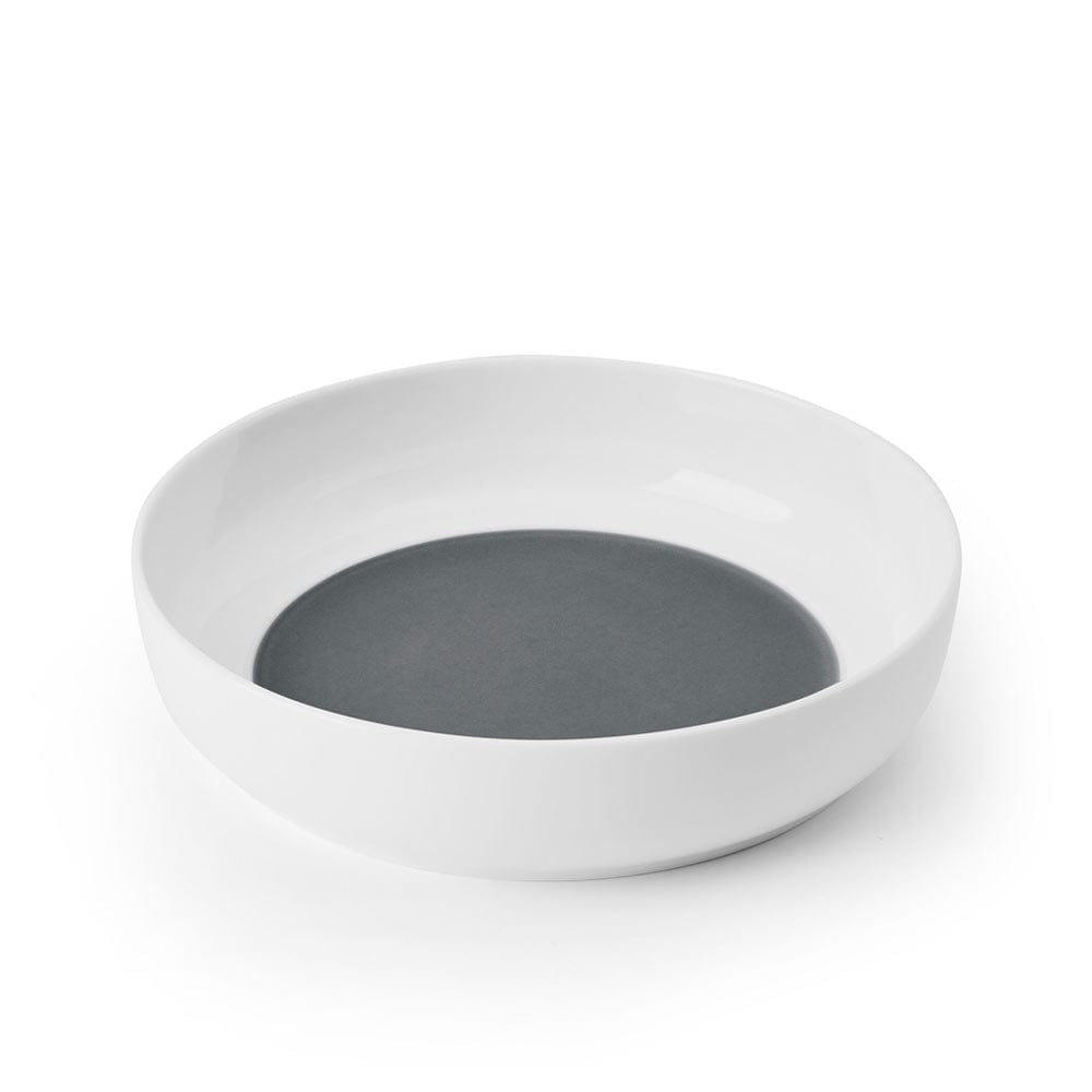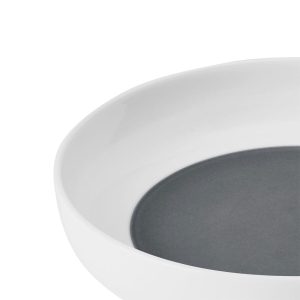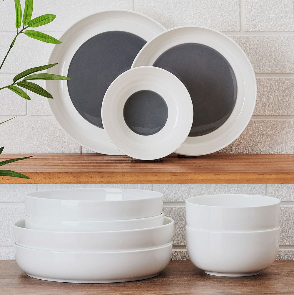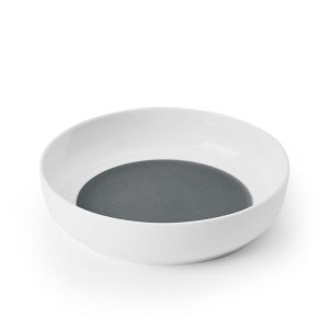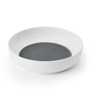 This Austyn Dinnerware Bowl Set features a modern. walled design and surprise color splash of deep grey on the interior bottoms. and is perfect for casual or formal dining.