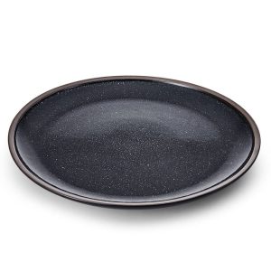 This Barrett Black Round Platter features a black speckle pattern that dazzles with a glossy finish and a thick metallic band around the rim. bringing a stunningly modern look to all your gatherings.