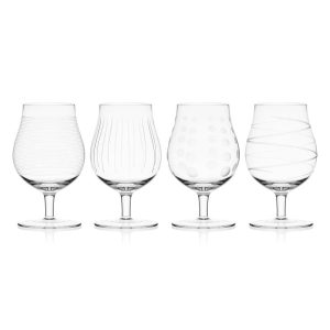 The fun and whimsical designs of the Cheers collection set a festive mood at any gathering. These beer glasses have a handsome. tulip shaped bowl that enhances aromas and flavors of beers. while the fine stem keeps the heat of your hands away from the contents. Each glass has a distinct dot. line. or swirl pattern. so your guests can easily identify their glass.