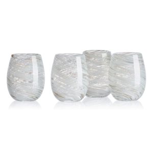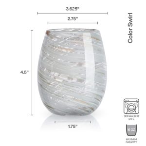 Bold and modern. this Color Swirl Set of 4 Stemless Wine Glasses with tones of warm grey and white swrils is a unique. modern way to serve wine in style. They are also perfect for enjoying juice. soda. iced tea. water. and more. Beautifully handcrafted of glass. each glass is unique and catches the eye with distinct. delicate bubble accents and shades of gray that sparkle in the light.