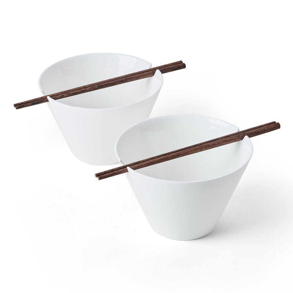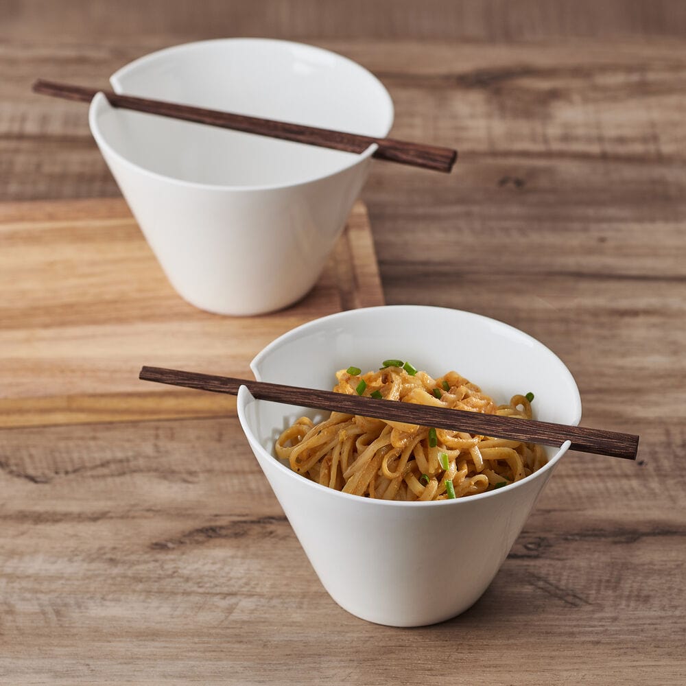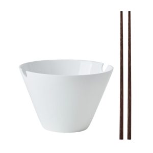 These Delray Large Noodle Bowls with Chopsticks features a bowl with contemporary angles. a deep interior. plus two convenient cutout handles that the included chopsticks can easily slide through to keep the set stored together when not in use.