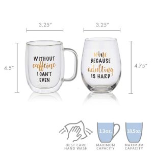 This stylish and whimsical Mikasa Glass Mug and Stemless Wine Set offers sentiments expressing the perfect justifications for your favorite liquid indulgences! Sleek and contemporary. each glass features a unique sentiment in black and gold metallic lettering. The mug reads WITHOUT caffeine I CAN’T EVEN. stemless wine glass reads Wine BECAUSE adulting IS HARD.