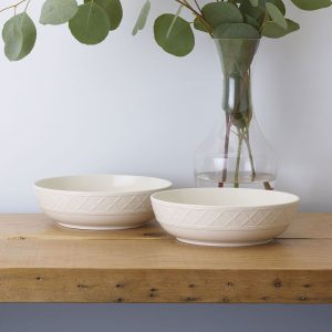 Gently scalloped edges and curves on these generous sized pieces add grace every time you set the table. Its rich cream color makes French Countryside a perfect base pattern to mix with colorful accent pieces. A best selling pattern. a complete suite of accessories is available to create a classically stylish casual dining statement. Expertly crafted from stoneware. Microwave and dishwasher safe. Rim soup pasta bowl measures 8-1/4 inch diameter and holds 15 ounces.