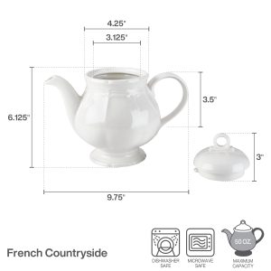 Gently scalloped edges and curves on these generous sized pieces add grace every time you set the table. Its rich cream color makes French Countryside a perfect base pattern to mix with colorful accent pieces. A best selling pattern. a complete suite of accessories is available to create a classically stylish casual dining statement. Expertly crafted from stoneware. Microwave and dishwasher safe. This tea server measures 9-1/2 x 6 x 7-3/4 inches high and holds 46 ounces.