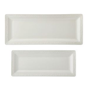 • Set of 2 trays includes 1 large bread tray measuring 15 inches long by 6 inches wide. and 1 small bread tray measuring 12 inches long by 5 inches wide • Crafted of Stoneware • Dishwasher and Microwave safe