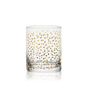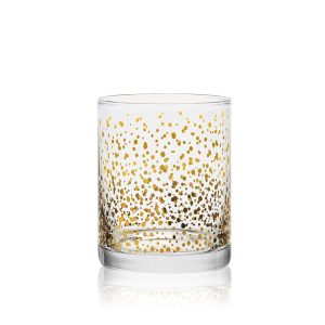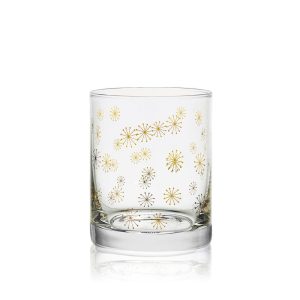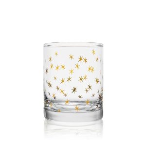 This Party Double Old Fashioned Whiskey Glass Set is sleek and streamlined with contemporary curves. and adorned with patterns of glittery gold and silver. featuring four distinct celebratory patterns. like sparkly confetti. shimmery bubbles. twinkling stars. and firework bursts.