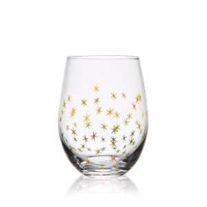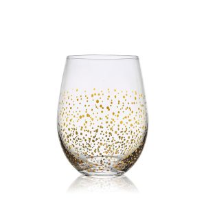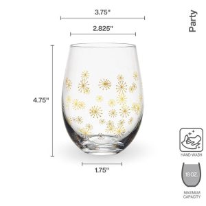 This Party Stemless Wine Glass Set is sleek and streamlined with contemporary curves. and adorned with patterns of glittery gold and silver. featuring four distinct celebratory patterns. like sparkly confetti. shimmery bubbles. twinkling stars. and firework bursts.