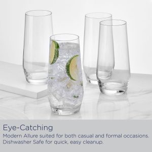 • Set of 4 Includes: each glass measures 6-1/2 inches tall with a 3-inch diameter and a 19-fluid ounce capacity • Crafted of lead-free crystal • Dishwasher safe