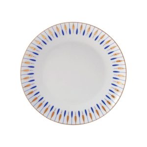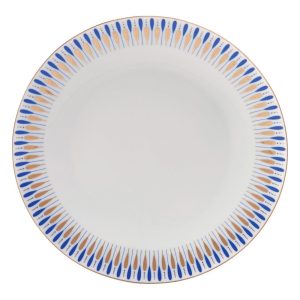 This Starburst Blue Dinnerware Set features a white body with a blue and metallic gold teardrop design that seems to radiate off the edge of each piece. adding modern allure to your tabletop display.