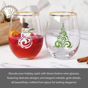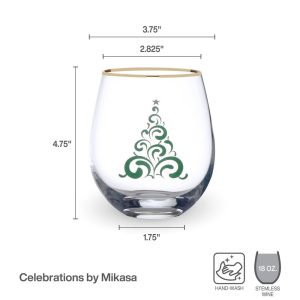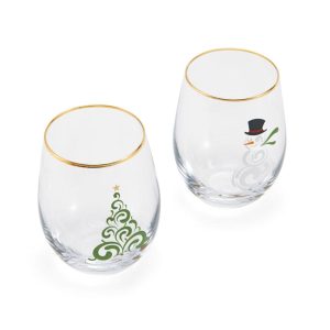 This Celebrations by Mikasa Tree and Snowman Stemless Wine glasses are perfect for holiday parties. Clear. stemless glasses feature one White Snowman and one Christmas Tree on the bowl. each decorated with a festive gold rim. Comes in a festive gift box. Hand wash. Set of 2 stemless wine glasses. each holds 18 ounces.