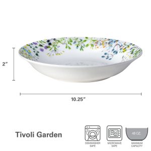 This Mikasa Tivoli Garden Serving Bowl features a white background. with delicate. colorful buds sprouting around the rim. and will make every meal feel like a walk through a fresh spring meadow.