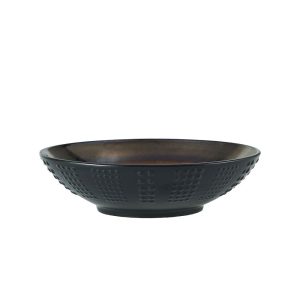 This Gourmet Basics Verona Cream Set of 4 Pasta Bowls features a combination of speckles. dots. and linear striations in rich earth tones. with a reactive glaze finish. The contrast between the smooth center and the metallic rim creates a dramatic. modern look that commands attention on your tabletop. Due to the nature and hand-crafted qualities of reactive glaze. no two pieces are exactly alike and will exhibit unique variations in color and pattern. Product may slightly differ from image shown.